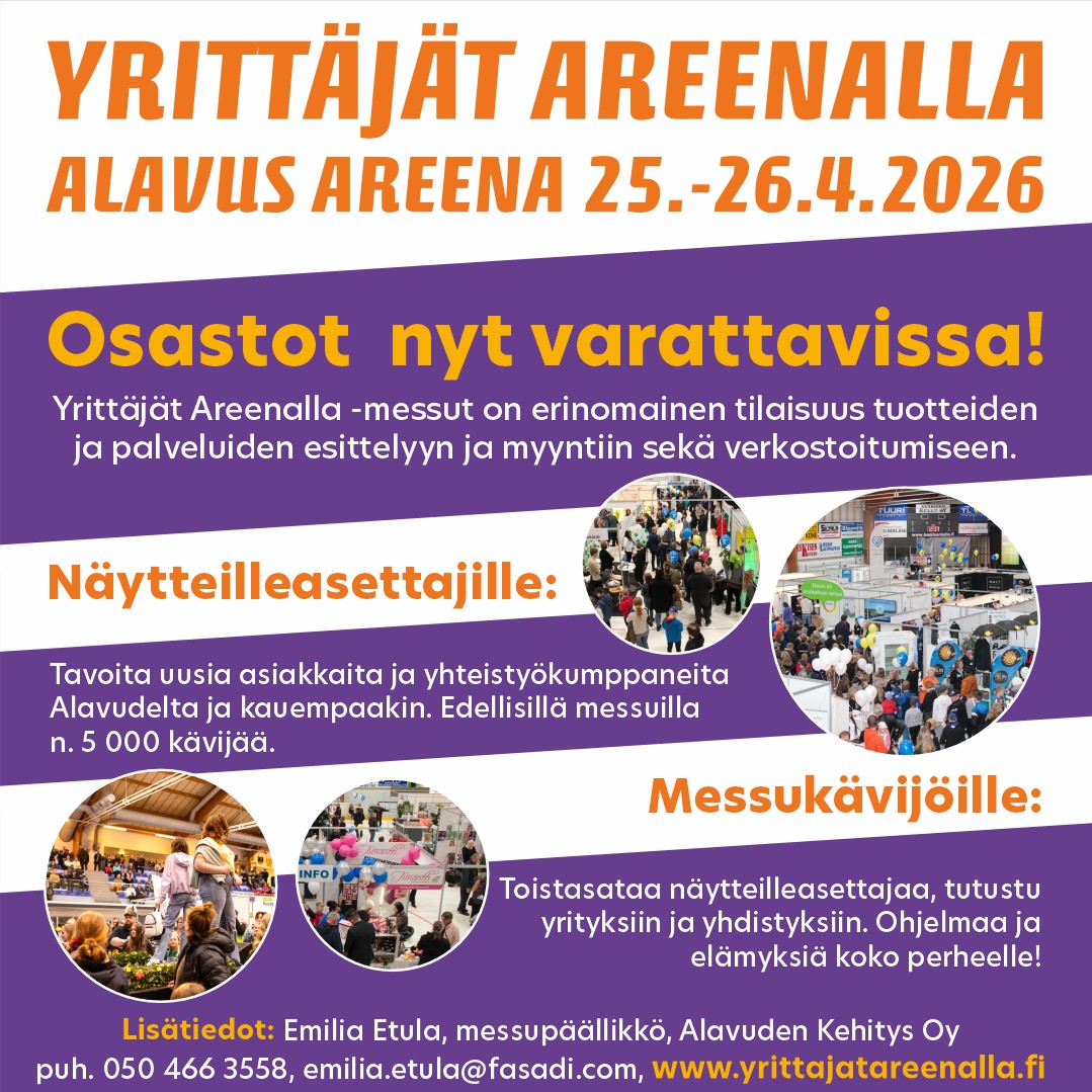 Yrittäjät Areenalla -messut lähestyy! 25.–26.4.2026 Alavus Areena täyttyy yrityksistä, yhdistyksistä, kohtaamisista ja uusista mahdollisuuksista. Tule esittelemään tuotteitasi, toimintaasi ja palveluitasi sekä verkostoitumaan ja kohtaamaan uusia asiakkaita tai yhteistyökumppaneita.