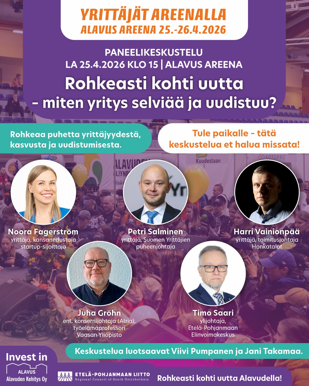 Yrittäjät Areenalla -messut lähestyy! 25.–26.4.2026 Alavus Areena täyttyy yrityksistä, yhdistyksistä, kohtaamisista ja uusista mahdollisuuksista. Tule esittelemään tuotteitasi, toimintaasi ja palveluitasi sekä verkostoitumaan ja kohtaamaan uusia asiakkaita tai yhteistyökumppaneita.